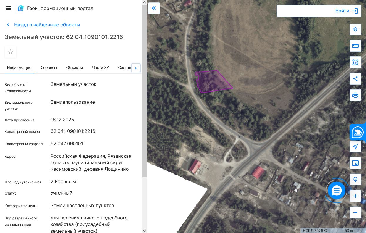 Земельный участок с кадастровым номером 62:04:1090101:2216 площадь 2500 по адресу Российская Федерация, Рязанская область, муниципальный округ Касимовский, деревня Лощинино