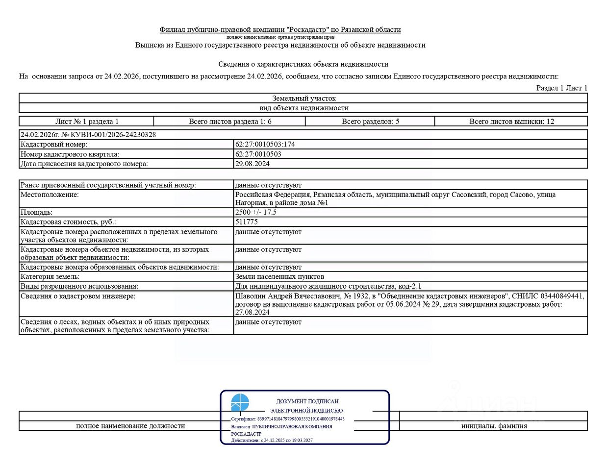 Земельный участок с кадастровым номером 62:27:0010503:174 площадь 2500 по адресу Российская Федерация, Рязанская область, муниципальный округ Сасовский, город Сасово, улица Нагорная, в районе дома 1