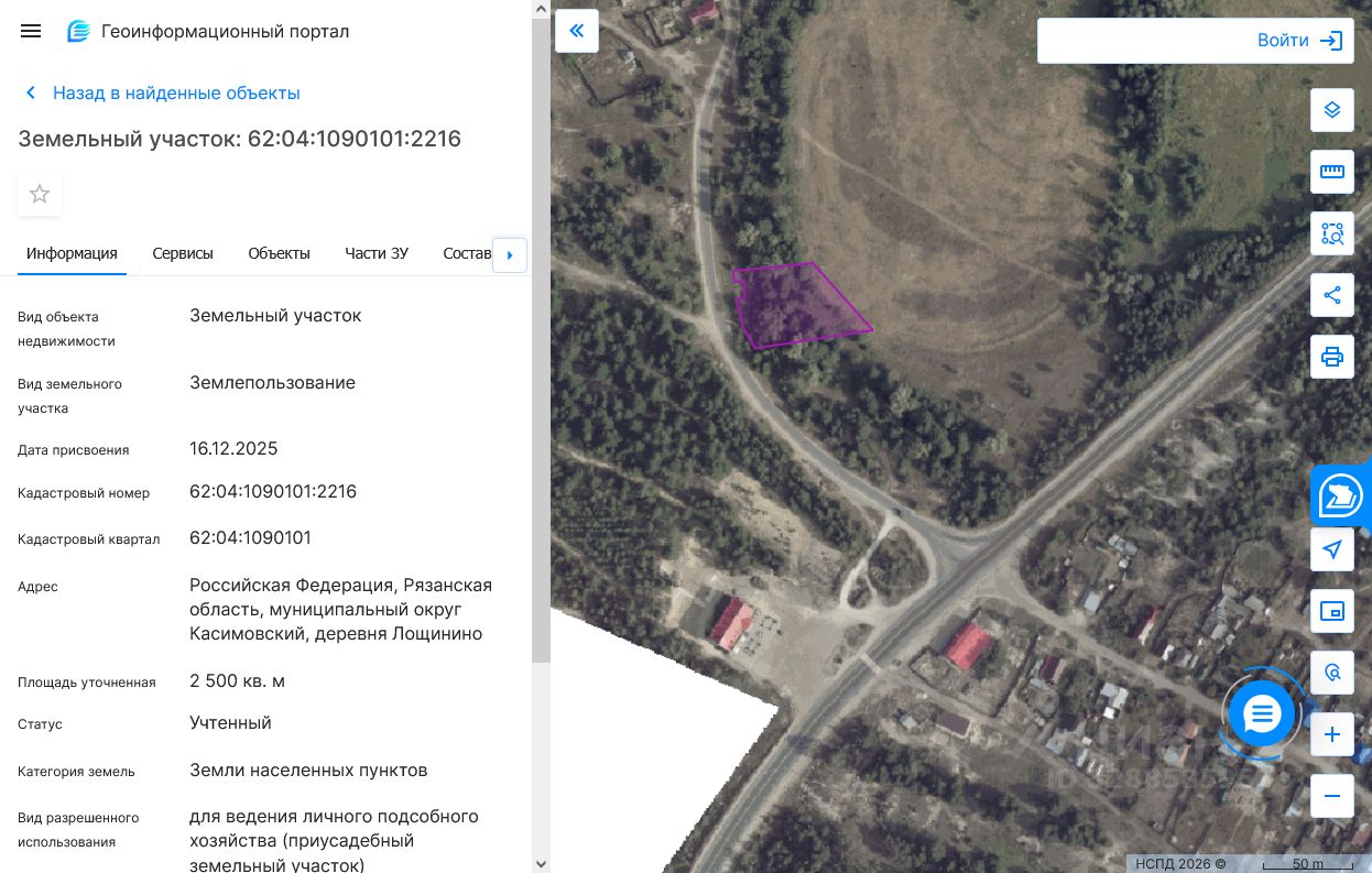 Земельный участок с кадастровым номером 62:04:1090101:2216 площадь 2500 по адресу Российская Федерация, Рязанская область, муниципальный округ Касимовский, деревня Лощинино