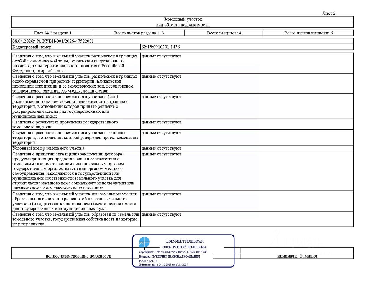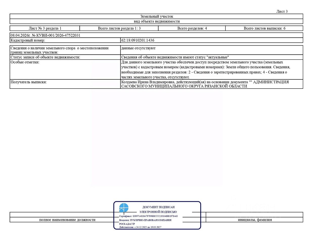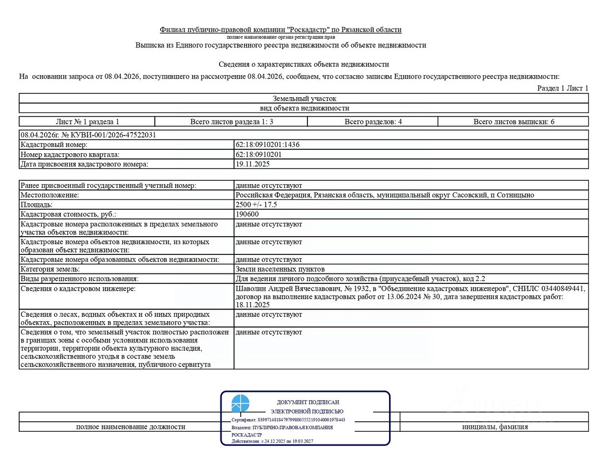 Земельный участок с кадастровым номером 62:18:0910201:1436 площадь 2500 по адресу Российская Федерация, Рязанская область, муниципальный округ Сасовский, п Сотницыно