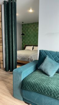 В зоне гостиной удобный диван , для размещения двух гостей .Для комфортного сна предусмотрен топпер .