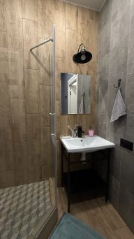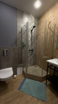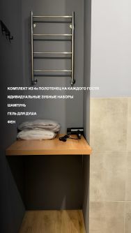 Душевая кабина, одноразовые тапочки, гель для душа, мыло, индивидуальные зубные наборы стиральный порошок, свежие полотенца (4 штуки на каждого гостя :банное, для лица, рук, ног).