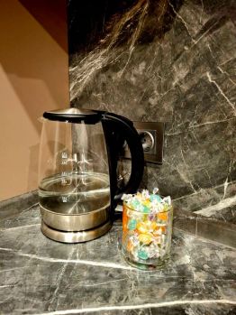 Посуда, кондиционер, посудомоечная машина, столовые приборы, холодильник, микроволновка, соль, сахар, чай.