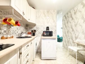 Полностью оборудованная кухня (плита, холодильник, микроволновка, посуда).