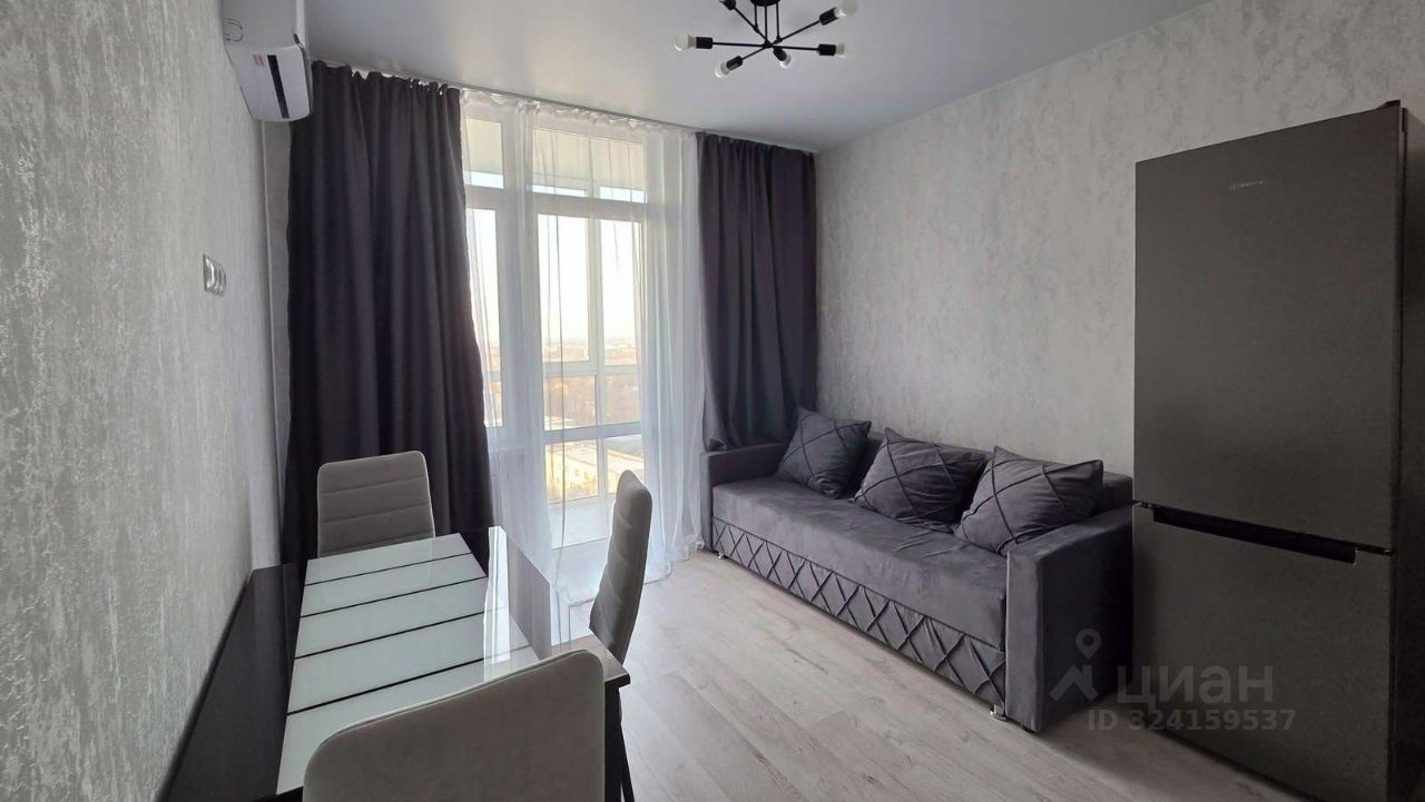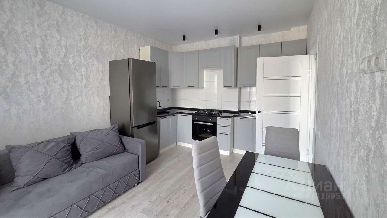 В кухне- гостиной: встроенный кухонный гарнитур, газовая варочная панель, электрический духовой шкаф, холодильник, обеденный стол и стулья, диван.