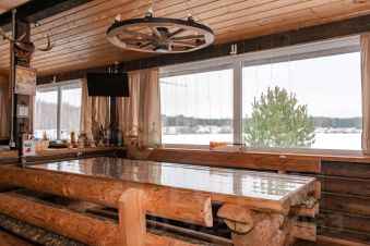 Гостевой дом оснащен просторной кухней-гостинной с большим столом и уютным диваном