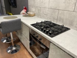 Гостиная-кухня: диван кровать, полный набор посуды, кухонный гарнитур, новый холодильник, газовая плита, электрический духовой шкаф, большой смарт телевизор samsung