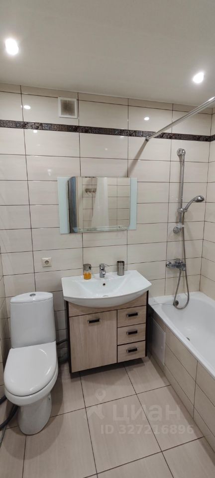 Квартира полностью готова для комфортного проживания. Совмещённый санузел оборудован ванной. На кухне и в комнате есть вся необходимая мебель. Из техники: кондиционер, холодильник, телевизор и стиральная машина.