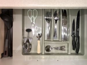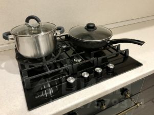 Кухня: кухонный гарнитур, полный набор посуды, сковорода, кастрюля, холодильник, газовая плита с автоподжигом, стол, 2 стула + 2 табурета, электрический чайник.