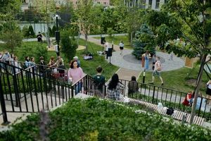 Двор-Парк с огромным числом зелени и цветов летом.