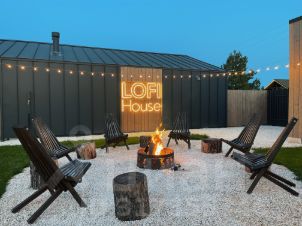 ~ костровая чаша, окруженная трендовыми креслами Кентукки и маленькими сосенками
