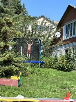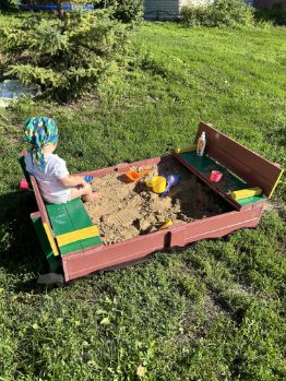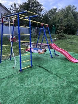 Во дворе большой батут для детей, песочница, детский комплекс с качелями, горкой