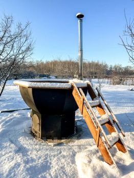 - баня-бочка на дровах, с качественными берёзовыми и дубовыми вениками, с комфортным пребыванием до семи человек;