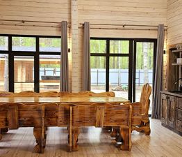 Огромная гостиная (47 кв м) с панорамными окнами и видом на лес
