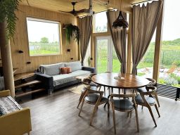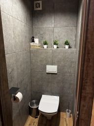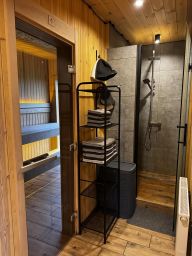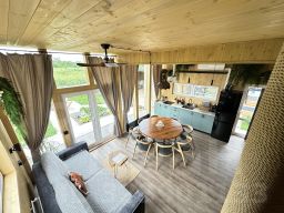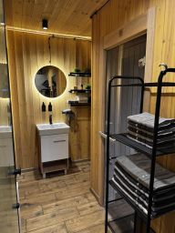 В доме есть все для комфортного проживания: 2 просторные спальни с двухспальными кроватями на втором этаже и 2 раскладных двухместных дивана в гостиной на первом этаже. В санузле для гостей подготовлены гель для душа, шампунь, зубные щетки, фен и комплект полотенец с тапочками. Кухня оборудована микроволновкой, плитой, холодильником, набором посуды на 8 персон, кастрюлями, сковородками, столовыми приборами и чайником. Для досуга в доме: Wi-Fi, проектор в гостиной, телевизор со Smаrt ТV в спальне, настольные игры, аудиосистема с блютуз подключением в гостиной. Сауна с панорамным остеклением, панно из кедра и гималайской солью (оплачивается дополнительно).