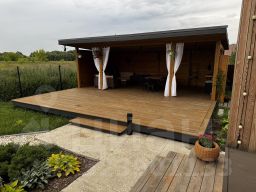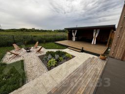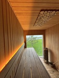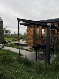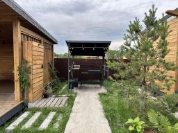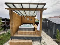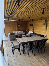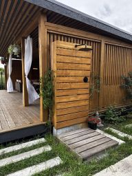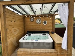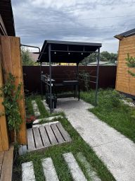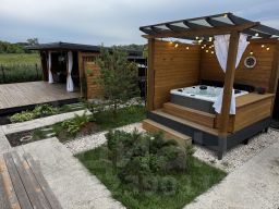 На территории: парковка на 5 автомобилей, большая беседка с кухонной зоной, обеденным столом на 8 персон, набором мебели из ротанга с кофейным столиком, вентилятором и инфракрасным обогревателем. Мангальная зона с крышей, подсветкой, шампурами и решёткой. Уютная костровая зона с барбекю. Уличный джакузи для круглогодичного использования температура 40 градусов в любую погоду, уличный душ. Баня и уличный джакузи оплачиваются дополнительно.