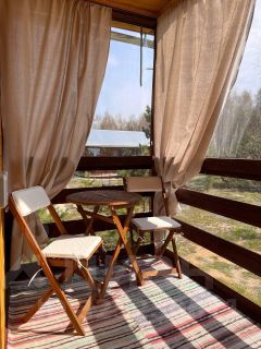 На территории 4 деревянных домика, выполненные в своей уникальной стилистике. Размещение зависит от конкретного домика. В каждом удобные спальные места, кондиционер, электрические обогреватели, водонагреватель на 100 л, Wi-Fi, Smart-TV, стиральная машина, сушилка для белья, утюг, гладильная доска, фен, кухня, оснащенная всем необходимым, постельное белье, полотенца, шампунь, гель для душа, мыло.