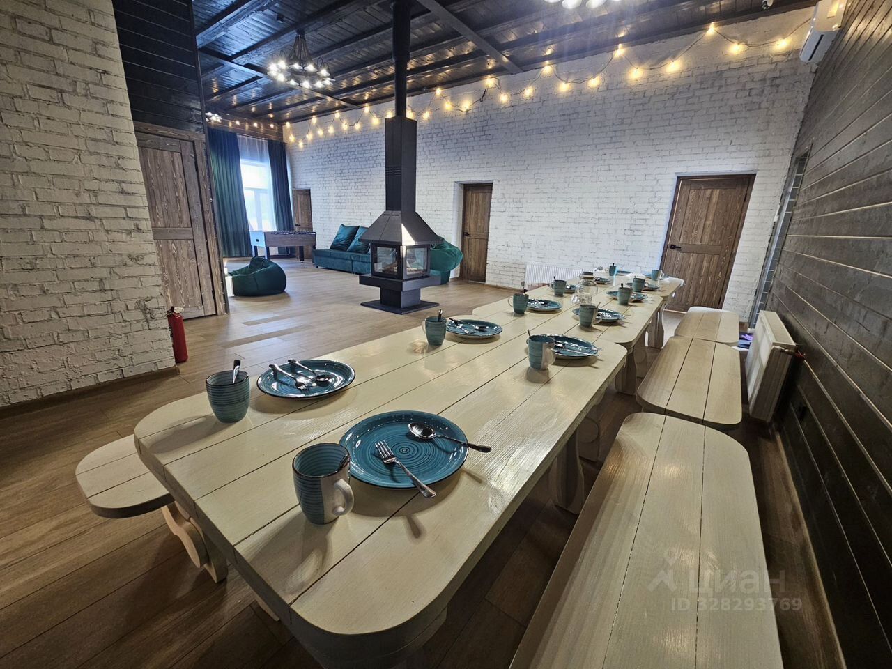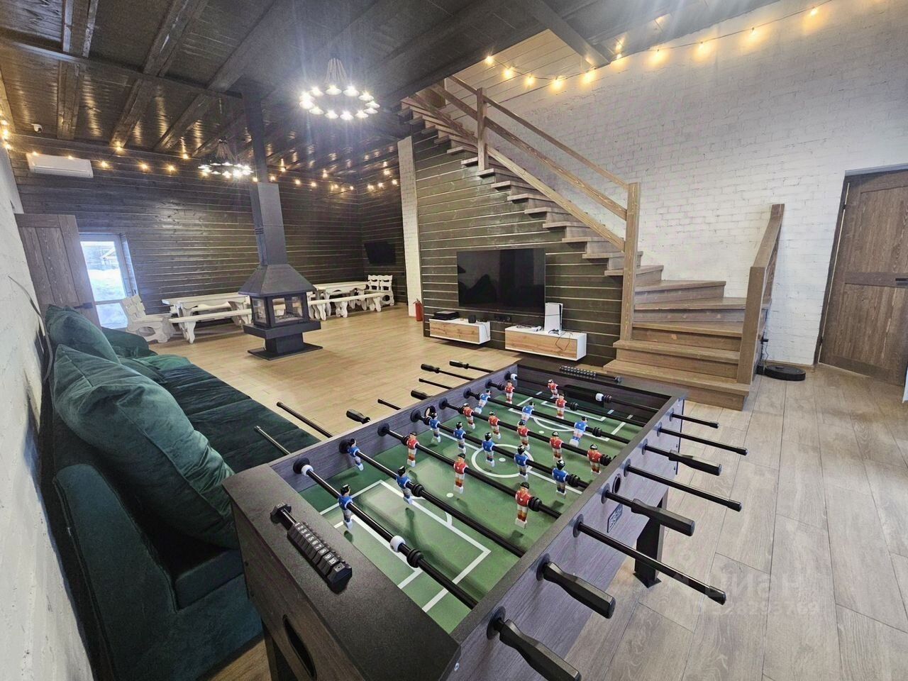 — Большая гостиная с камином, телевизором, playstation 5 и обеденной зоной. Выход на веранду — идеальное место для отдыха на свежем воздухе.
