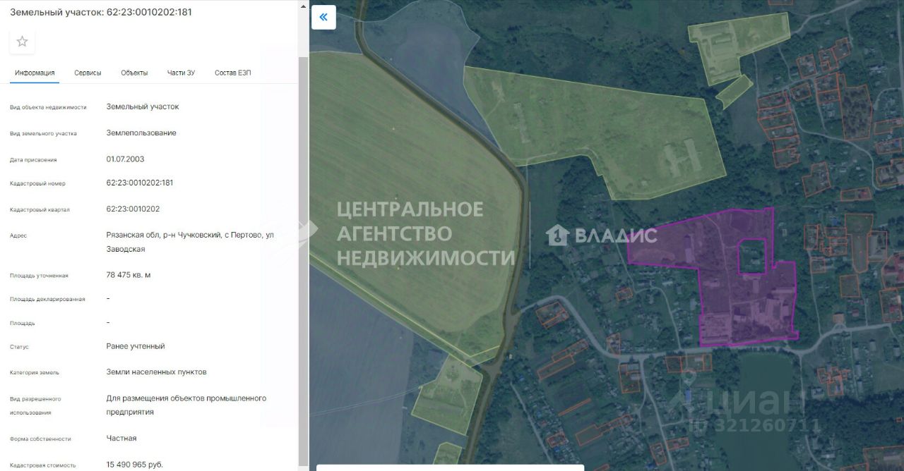 Общая площадь земельного участка площадь 78475 кв.м., адрес объекта: Рязанская область, Чучковский р-н, с.Пертово.