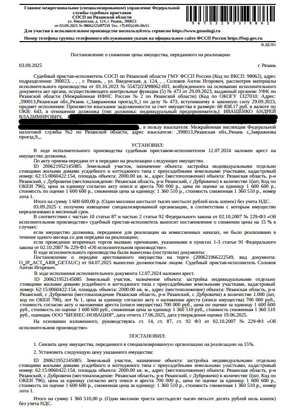 Земельный участок, категория земель: земли населенных пунктов, виды разрешенного использования: застройка индивидуальными отдельно стоящими жилыми домами усадебного и коттеджного типа с приусадебными земельными участками, площадь 2000 +/- 391 кв.м, кадастровый номер 62:15:0060422:154, адрес: Российская Федерация, Рязанская область, муниципальный район Рязанский, сельское поселение Дубровическое, село Дубровичи, улица Луговая, земельный участок 78. Земельный участок полностью расположен в границах зоны с реестровым номером 62:00-6.648 от 06.04.2021, ограничение использования земельного участка в пределах зоны. Вид ограничений (обременений): ограничения прав на земельный участок, предусмотренные ст. 56 ЗК РФ. Взыскатель: МИФНС 2 по Рязанской области. Начальная цена 1 360 510 (Один миллион триста шестьдесят тысяч пятьсот десять) руб. 00 коп., без НДС, сумма задатка 670 000 (Шестьсот семьдесят тысяч) руб. 00 коп. Шаг аукциона 1%: 13 605 (Тринадцать тысяч шестьсот пять) руб. 10 коп.
