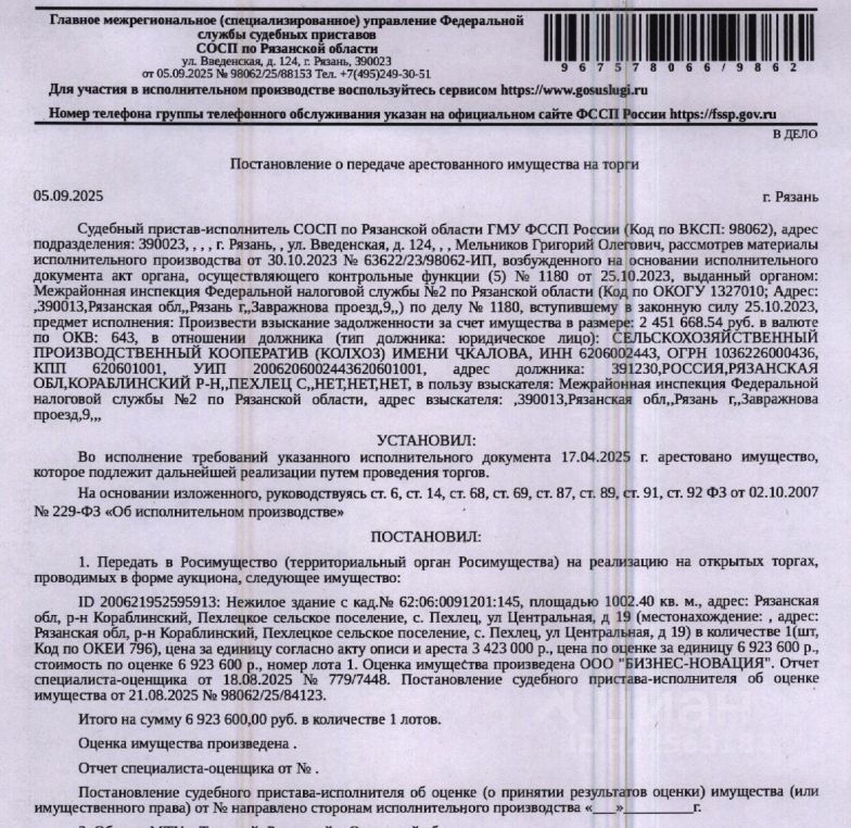 Здание, назначение: нежилое, наименование: здание, площадь 1002,4 кв.м, кадастровый номер 62:06:0091201:145, местоположение: Рязанская обл, р-н Кораблинский, Пехлецкое сельское поселение, с Пехлец, ул Центральная, д 19. Сведениями о земельном участке, на котором расположено здание, Организатор торгов не располагает. Взыскатель: МИФНС 2 по Рязанской области. Начальная цена: 6 923 600 (Шесть миллионов девятьсот двадцать три тысячи шестьсот) руб. 00 коп., без НДС. Задаток: 3 400 000 (Три миллиона четыреста тысяч) руб. 00 коп. Шаг аукциона 1%: 69 236 (Шестьдесят девять тысяч двести тридцать шесть) руб. 00 коп.