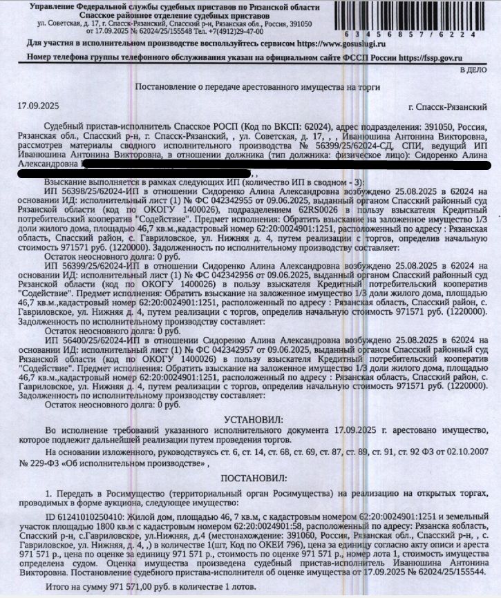 • Здание, назначение: жилое, наименование: жилой дом, площадь 46,7 кв.м., кадастровый номер 62:20:0024901:1251, местоположение: Рязанская обл., Спасский р-н, с. Гавриловское, ул. Нижняя, д.4. Сведениями о зарегистрированных по данному адресу лицах Организатор торгов не располагает. • Земельный участок, категория земель: земли населенных пунктов, виды разрешенного использования: для ведения личного подсобного хозяйства, площадь 1800 +/- 15 кв.м., кадастровый номер 62:20:0024901:58, местоположение: Рязанская обл, р-н Спасский, с Гавриловское, ул Нижняя, д 4. Залогодержатель: КПК "Содействие". Начальная цена: 971 571 (Девятьсот семьдесят одна тысяча пятьсот семьдесят один) руб. 00 коп., без НДС. Задаток: 40 000 (Сорок тысяч) руб. 00 коп. Шаг аукциона 1%: 9 715 (Девять тысяч семьсот пятнадцать) руб. 71 коп.