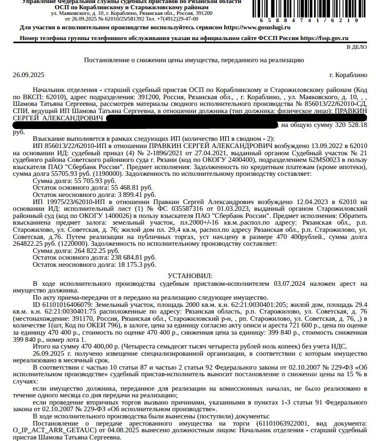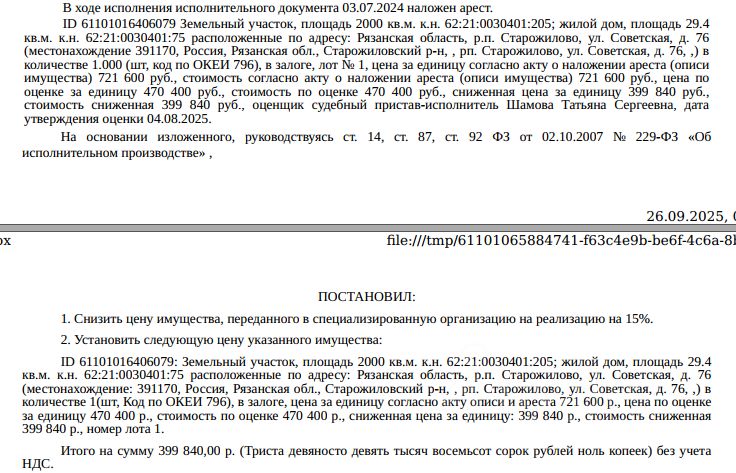 • Здание, назначение: жилое, наименование: жилой дом, площадь 29,4 кв.м., кадастровый номер 62:21:0030401:75, местоположение: Рязанская область, р-н Старожиловский, рп Старожилово, ул Советская, д 76. Сведениями о зарегистрированных по данному адресу лицах Организатор торгов не располагает; • Земельный участок, категория земель: земли населенных пунктов, виды разрешенного использования: личное подсобное хозяйство, площадь 2000 +/- 16 кв.м, кадастровый номер 62:21:0030401:205, местоположение: Рязанская область, р-н Старожиловский, рп Старожилово, ул Советская, д 76. Залогодержатель: ПАО "Сбербанк России". Начальная цена: 399 840 (Триста девяносто девять тысяч восемьсот сорок) руб. 00 коп., без НДС. Задаток: 10 000 (Десять тысяч) руб. 00 коп.; Шаг аукциона 1%: 3 998 (Три тысячи девятьсот девяносто восемь) руб. 40 коп.