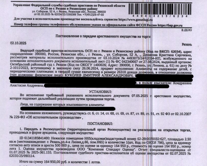 Помещение, назначение: нежилое, наименование: нежилое помещение Н65 в многоквартирном доме, площадь 2,5 кв.м., кадастровый номер 62:29:0070032:627, местоположение: Рязанская область, г Рязань, ул 4-я Линия, д 66, пом Н65. Взыскатель: Кондрахина А.А. Начальная цена: 164 950 (Сто шестьдесят четыре тысячи девятьсот пятьдесят) руб. 00 коп., без НДС. Задаток: 80 000 (Восемьдесят тысяч) руб. 00 коп. Шаг аукциона 1%: 1 649 (Одна тысяча шестьсот сорок девять) руб. 50 коп.