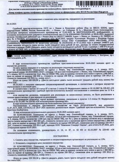 Помещение, назначение: нежилое, наименование: нежилое помещение, площадь 4,8 кв.м, кадастровый номер 62:29:0100001:20427, адрес: Рязанская область, г.о. город Рязань, г Рязань, мкр. Олимпийский городок, д. 5, помещ. Н271. Взыскатель: ПАО "Совкомбанк". Начальная цена: 229 355 (Двести двадцать девять тысяч триста пятьдесят пять) руб. 50 коп., без НДС. Задаток: 110 000 (Сто десять тысяч) руб. 00 коп. Шаг аукциона 1%: 2 293 (Две тысячи двести девяносто три) руб. 56 коп.