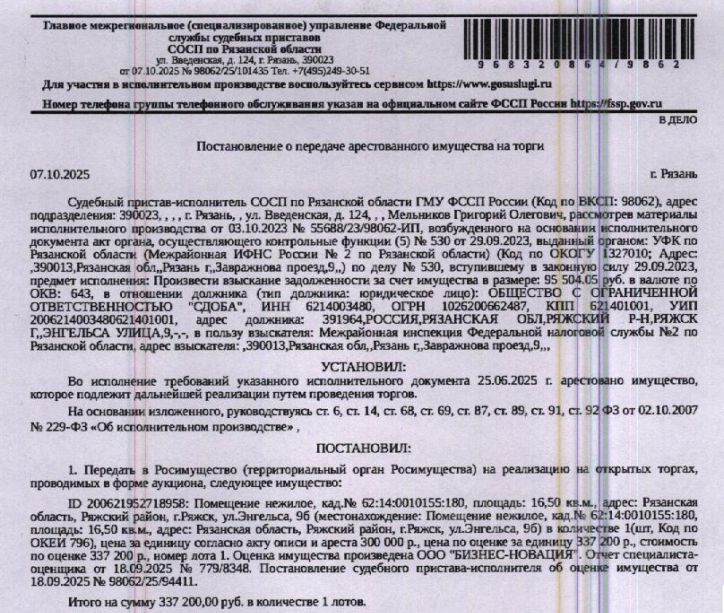 Помещение, назначение: нежилое, наименование: нежилое помещение 12, площадь 16,5 кв.м., кадастровый номер 62:14:0010155:180, местоположение: Рязанская область, Ряжский район, г.Ряжск, ул.Энгельса, 9б. Взыскатель: МИФНС 2 по Рязанской области. Начальная цена: 337 200 (Триста тридцать семь тысяч двести) руб. 00 коп., без НДС. Задаток: 160 000 (Сто шестьдесят тысяч) руб. 00 коп. Шаг аукциона 1%: 3 372 (Три тысячи триста семьдесят два) руб. 00 коп.
