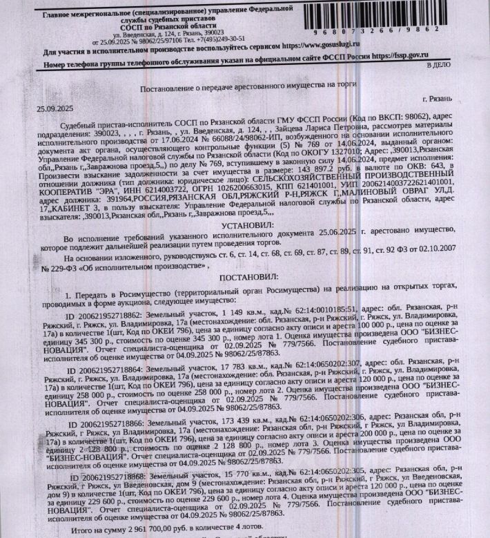 Земельный участок, земли населенных пунктов, виды разрешенного использования: для размещения хозяйственных построек, площадь 1149 +/- 11 кв.м., кадастровый номер 62:14:0010185:51, местоположение установлено относительно ориентира, расположенного за пределами участка. Ориентир "нежилое здание". Участок находится примерно в 100м. по направлению на юго-восток от ориентира. Почтовый адрес ориентира: обл. Рязанская, р-н Ряжский, г. Ряжск, ул. Владимировка, 17а. В пределах земельного участка расположены объекты недвижимости с кадастровыми номерами 62:14:0000000:625, 62:14:0010185:92, сведениями о правообладателях Организатор торгов не располагает. Вид ограничений (обременений): ограничения прав на земельный участок, предусмотренные ст. 56 ЗК РФ. Взыскатель: УФНС по Рязанской области. Начальная цена: 345 300 (Триста сорок пять тысяч триста) руб. 00 коп., без НДС. Задаток: 170 000 (Сто семьдесят тысяч) руб. 00 коп. Шаг аукциона 1%: 3 453 (Три тысячи четыреста пятьдесят три) руб. 00 коп.