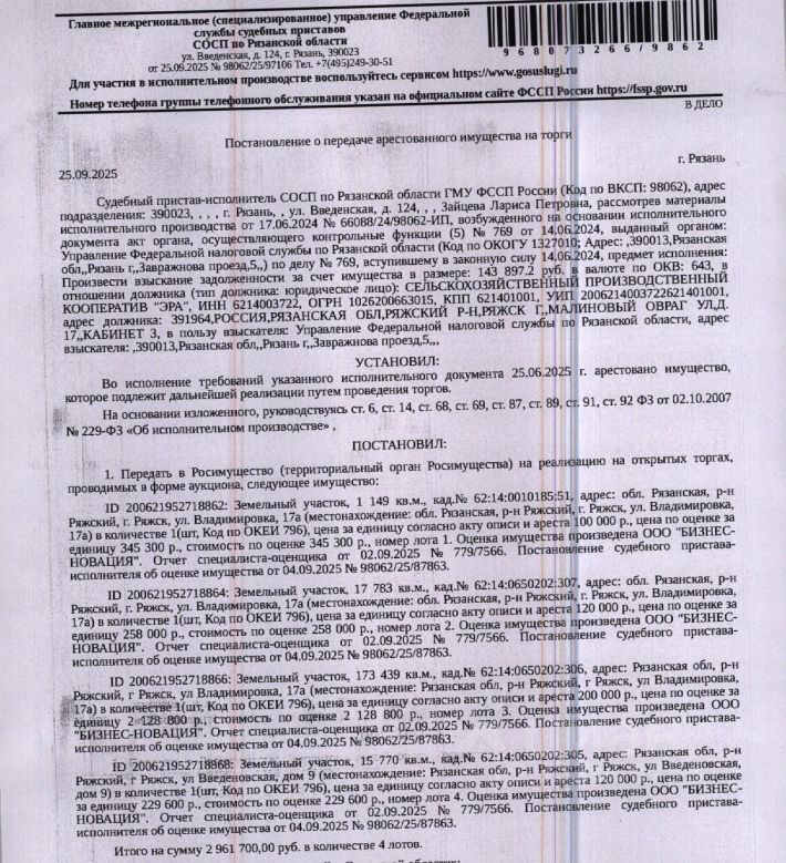 Земельный участок, категория земель: земли сельскохозяйственного назначения, виды разрешенного использования: для размещения хозяйственных построек, площадь 17783 +/- 1166 кв.м., кадастровый номер 62:14:0650202:307, местоположение установлено относительно ориентира, расположенного за пределами участка. Ориентир "нежилое здание". Почтовый адрес ориентира: обл. Рязанская, р-н Ряжский, г. Ряжск, ул. Владимировка, 17а. В пределах земельного участка расположен объект недвижимости с кадастровым номером 62:14:0000000:625, сведениями о правообладателе Организатор торгов не располагает. Вид ограничений (обременений): ограничения прав на земельный участок, предусмотренные ст. 56 ЗК РФ. Взыскатель: УФНС по Рязанской области. Начальная цена: 258 000 (Двести пятьдесят восемь тысяч) руб. 00 коп., без НДС. Задаток: 120 000 (Сто двадцать тысяч) руб. 00 коп. Шаг аукциона 1%: 2 580 (Две тысячи пятьсот восемьдесят) руб. 00 коп.