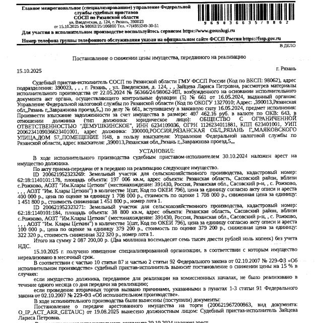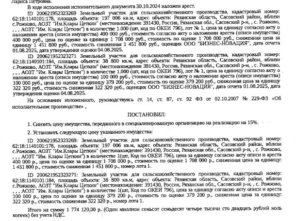 Земельный участок, категория земель: земли сельскохозяйственного назначения, виды разрешенного использования: для сельскохозяйственного производства, площадь 38800 +/- 1724 кв.м, кадастровый номер 62:18:1140101:184, местоположение: Рязанская область, Сасовский район, вблизи с.Рожково, АОЗТ "Им.Клары Цеткин". Вид ограничений (обременений): ограничения прав на земельный участок, предусмотренные ст. 56 ЗК РФ. Взыскатель: УФНС по Рязанской области. Начальная цена: 322 320 (Триста двадцать две тысячи триста двадцать) руб. 00 коп., без НДС. Задаток: 160 000 (Сто шестьдесят тысяч) руб. 00 коп. Шаг аукциона 1%: 3 223 (Три тысячи двести двадцать три) руб. 20 коп.