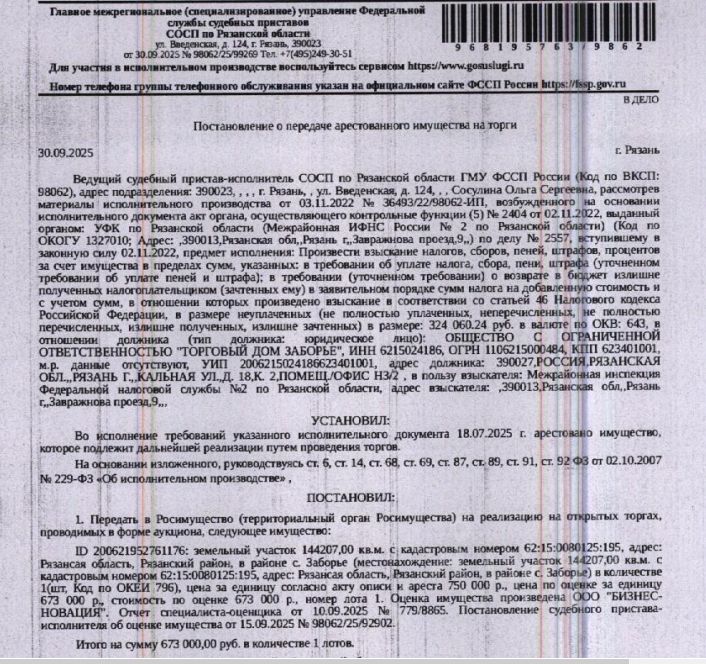 Земельный участок, категория земель: земли сельскохозяйственного назначения, виды разрешенного использования: для сельскохозяйственного производства, площадь 144207 +/- 3322.78 кв.м., кадастровый номер 62:15:0080125:195, местоположение: Российская Федерация, Рязанская область, р-н Рязанский, в районе с Заборье. Земельный участок полностью расположен в границах зоны с реестровым номером 62:00-8.1 от 25.01.2016, ограничение использования земельного участка в пределах зоны. Вид ограничений (обременений): ограничения прав на земельный участок, предусмотренные ст. 56 ЗК РФ. Залогодержатель: МИ ФНС 2 по Рязанской области. Начальная цена: 673 000 (Шестьсот семьдесят три тысячи) руб. 00 коп., без НДС. Задаток: 30 000 (Тридцать тысяч) руб. 00 коп. Шаг аукциона 1%: 6 730 (Шесть тысяч семьсот тридцать) руб. 00 коп.