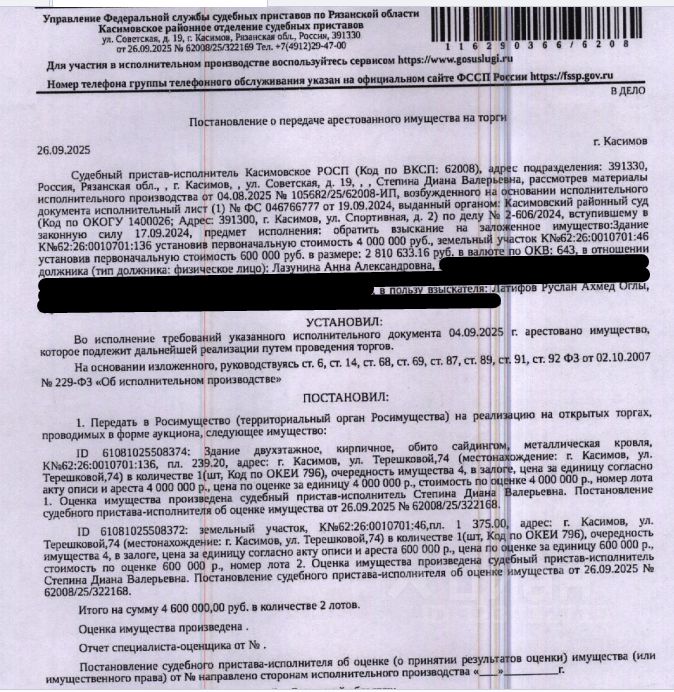 Здание, назначение: жилое, наименование: жилой дом, кадастровый номер 62:26:0010701:136, площадь 239,2 кв.м., местоположение: по адресу Рязанская обл., г.Касимов, ул.Терешковой, д.74. Сведениями о зарегистрированных по данному адресу лицах Организатор торгов не располагает. • Земельный участок, категория земель: земли населенных пунктов, виды разрешенного использования: для размещения и эксплуатации жилого дома, кадастровый номер 62:26:0010701:46, площадь 1375 +/- 7 кв.м., местоположение: Рязанская обл, г. Касимов, ул. Терешковой, д. 74. З/у полностью расположен в границах зоны с реестровым номером 62:26-6.312 от 22.06.2023, ограничение использования з/у в пределах зоны. Ограничения прав на земельный участок, предусмотренные ст. 56 ЗК РФ. Залогодержатель: Латифов Р.А. Оглы. Начальная цена: 4 600 000 (Четыре миллиона шестьсот тысяч) руб. 00 коп., без НДС.Задаток: 220 000 (Двести двадцать тысяч) руб. 00 коп. Шаг аукциона 1%: 46 000 (Сорок шесть тысяч) руб. 00 коп.