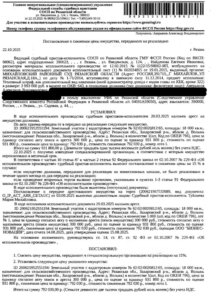 Земельный участок, категория земель: земли сельскохозяйственного назначения, виды разрешенного использования: для сельскохозяйственного производства, площадь 18000 +/- 47 кв.м, кадастровый номер 62:02:0020812:65, местоположение: Рязанская область, р-н Захаровский, вблизи д Волынь. Взыскатель: УФК по Рязанской области (Следственное управление Следственного комитета РФ в Рязанской области). Начальная цена: 792 030 (Семьсот девяносто две тысячи тридцать) руб. 00 коп., без НДС. Задаток: 390 000 (Триста девяносто тысяч) руб. 00 коп. Шаг аукциона 1%: 7 920 (Семь тысяч девятьсот двадцать) руб. 30 коп.