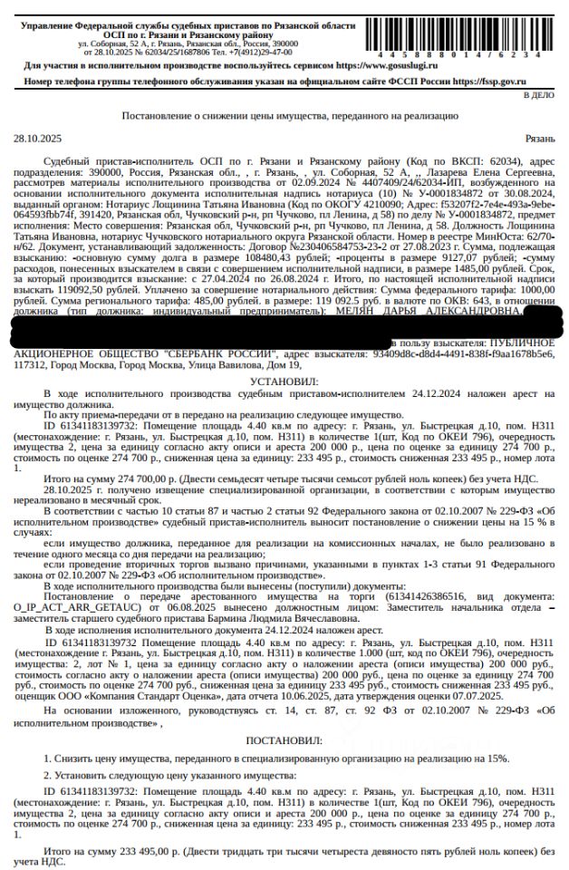 Помещение, назначение: нежилое, площадь 4,4 кв.м, кадастровый номер 62:29:0080098:10707, адрес: Российская Федерация, Рязанская область, городской округ город Рязань, город Рязань, Быстрецкая улица, дом 10, помещение Н311. Взыскатель: ПАО "Сбербанк России". Начальная цена: 233 495 (Двести тридцать три тысячи четыреста девяносто пять) руб. 00 коп., без НДС. Задаток: 110 000 (Сто десять тысяч) руб. 00 коп. Шаг аукциона 1%: 2 334 (Две тысячи триста тридцать четыре) руб. 95 коп.