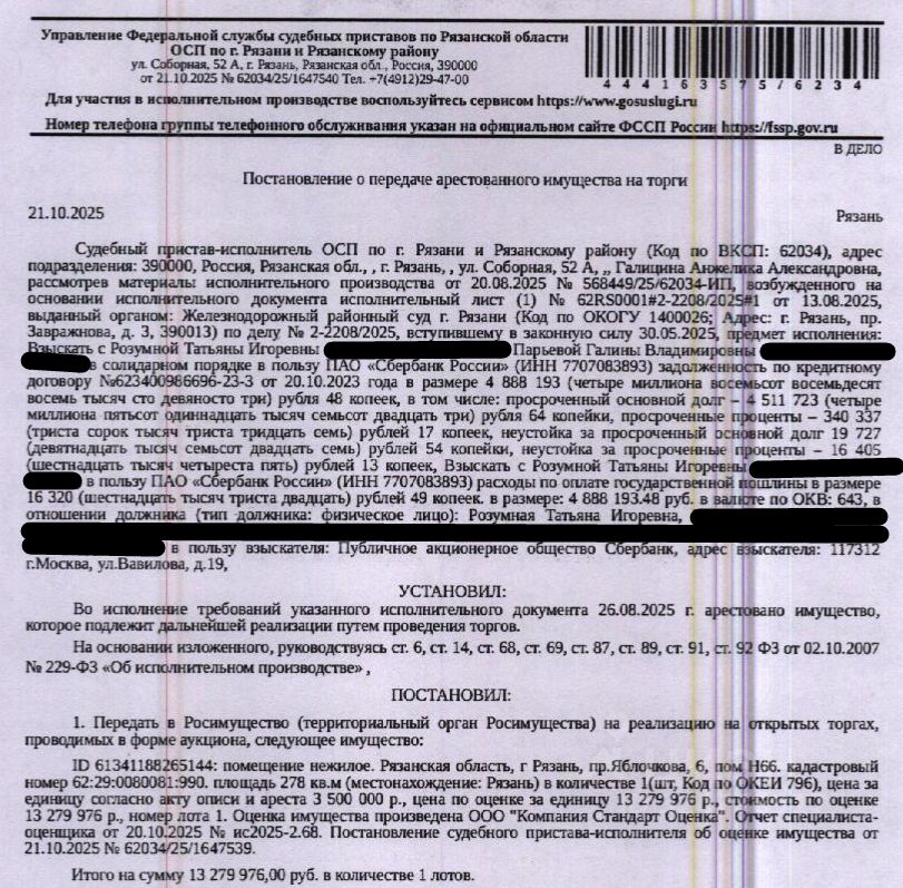 Помещение, назначение: нежилое, наименование: нежилое помещение Н66, площадь 278 кв.м, этаж 8, кадастровый номер 62:29:0080081:990, местоположение: Рязанская область, г Рязань, пр. Яблочкова, 6, пом Н66. Взыскатель: ПАО "Сбербанк России". Начальная цена: 13 279 976 (Тринадцать миллионов двести семьдесят девять тысяч девятьсот семьдесят шесть) руб. 00 коп., без НДС. Задаток: 6 600 000 (Шесть миллионов шестьсот тысяч) руб. 00 коп. Шаг аукциона 1%: 132 799 (Сто тридцать две тысячи семьсот девяносто девять) руб. 76 коп.