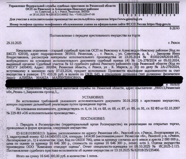 Здание, назначение: нежилое, наименование: ферма (МТФ), кадастровый номер 62:14:0450101:124, площадь 1414,9 кв.м, местоположение: Рязанская обл., Ряжский р-н, г. Ряжск, Лесопарковая ул., 1. Согласно ответу Администрации Ряжского муниципального округа от 07.05.2025 в связи с отсутствием в ЕГРН координат характерных точек границ здания определить, на каком именно земельном участке оно расположено, не представляется возможным. Взыскатель: УФНС по Рязанской области. Начальная цена: 16 646 300 (Шестнадцать миллионов шестьсот сорок шесть тысяч триста) руб. 00 коп., в том числе НДС. Задаток: 8 300 000 (Восемь миллионов триста тысяч) руб. 00 коп. Шаг аукциона 1%: 166 463 (Сто шестьдесят шесть тысяч четыреста шестьдесят три) руб. 00 коп.