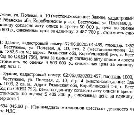 Здание, назначение: нежилое, наименование: склад, к.н. 62:06:0020201:497, пл. 1003,2 кв.м; Здание, назначение: нежилое, наименование: склад, к.н. номер 62:06:0020201:489, пл. 1352,5 кв.м; Здание, назначение: нежилое, наименование: механическая мастерская, кадастровый номер 62:06:0020201:435, площадь 411,9 кв.м; Земельный участок, категория земель: земли населенных пунктов, ВРИ: для строительства механических мастерских, кадастровый номер 62:06:0020201:272, площадь 15572 +/- 87 кв.м, местоположение: Рязанская обл, р-н Кораблинский, с/п Молвинослободское, с Бестужево, ул Полевая, дом 10.Вид ограничений (обременений): ограничения прав на земельный участок, предусмотренные ст. 56 ЗК РФ. Взыскатель: МИФНС 2 по Рязанской области.Начальная цена: 11 694 045 (Одиннадцать миллионов шестьсот девяносто четыре тысячи сорок пять) руб. 00 коп., без НДС, сумма задатка: 5 800 000 (Пять миллионов восемьсот тысяч) руб. 00 коп. Шаг аукциона 1%: 116 940 (Сто шестнадцать тысяч девятьсот сорок) руб. 45 коп.