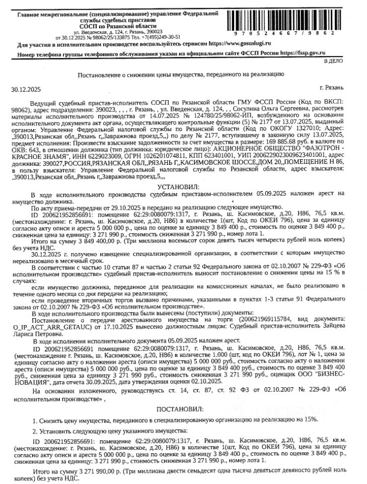 Помещение, назначение: нежилое, наименование: помещение, кадастровый номер 62:29:0080079:1317, цокольный этаж с, площадь 76,5 кв.м, местоположение: Рязанская область, г Рязань, ш Касимовское, д 20, Н86. Взыскатель УФНС по Рязанской области. Начальная цена: 3 271 990 (Три миллиона двести семьдесят одна тысяча девятьсот девяносто) руб. 00 коп., без НДС, сумма задатка 1 600 000 (Один миллион шестьсот тысяч) руб. 00 коп. Шаг аукциона 1%: 32 719 (Тридцать две тысячи семьсот девятнадцать) руб. 90 коп.