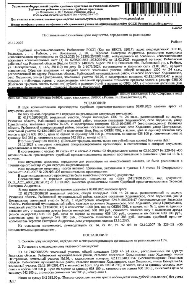 Земельный участок, категория земель: земли населенных пунктов, виды разрешенного использования: для индивидуального жилищного строительства, площадь 1300 +/- 24 кв.м., кадастровый номер 62:13:1040301:47, адрес: Рязанская область, муниципальный район Рыбновский, сельское поселение Ходынинское, село Ходынино, улица Центральная, земельный участок 126. Залогодержатель: ПАО "Сбербанк России". Начальная цена: 542 385 (Пятьсот сорок две тысячи триста восемьдесят пять) руб. 00 коп., без НДС. Задаток: 20 000 (Двадцать тысяч) руб. 00 коп. Шаг аукциона 1%: 5 423 (Пять тысяч четыреста двадцать три) руб. 85 коп.