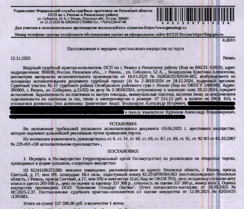 Помещение, назначение: нежилое, наименование: помещение, этаж подвал 0, площадь 18,4 кв.м., кадастровый номер 62:29:0090004:663, местоположение: Рязанская область, г Рязань, проезд Светлый, д 17, пом Н9. Согласно выписке ЕГРН от 24.11.2025 принято заявление о невозможности государственной регистрации перехода, прекращения, ограничения права и обременения на объект недвижимости без личного участия правообладателя или его законного представителя. Взыскатель: Курчавов А.В. Начальная цена: 337 300 (Триста тридцать семь тысяч триста) руб. 00 коп., без НДС. Задаток: 150 000 (Сто пятьдесят тысяч) руб. 00 коп. Шаг аукциона 1%: 3 373 (Три тысячи триста семьдесят три) руб. 00 коп.