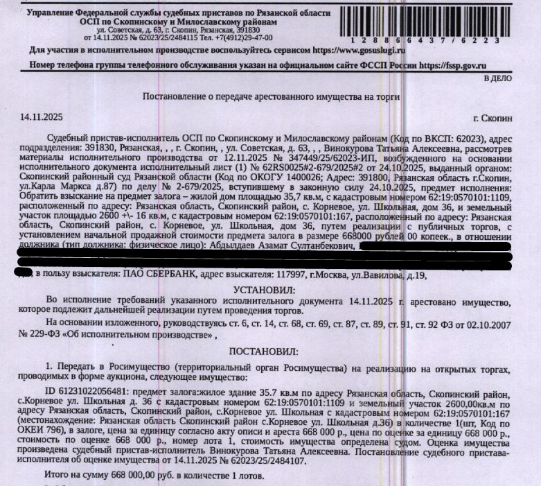 • Здание, назначение: жилое, наименование: жилой дом, площадь 35,7 кв.м., кадастровый номер 62:19:0570101:1109, местоположение: Рязанская обл., Скопинский р-н, с.Корневое, ул.Школьная, 36. Сведениями о зарегистрированных по данному адресу лицах Организатор торгов не располагает. • Земельный участок, категория земель: земли населенных пунктов, виды разрешенного использования: для ведения личного подсобного хозяйства, площадь 2600 +/- 16 кв.м., кадастровый номер 62:19:0570101:167, местоположение: Рязанская область, р-н Скопинский, с. Корневое, ул Школьная, д 36. Вид ограничений (обременений): ограничения прав на земельный участок, предусмотренные ст. 56 ЗК РФ. Залогодержатель: ПАО "Сбербанк России". Начальная цена: 668 000 (Шестьсот шестьдесят восемь тысяч) руб. 00 коп., без НДС. Задаток: 30 000 (Тридцать тысяч) руб. 00 коп. Шаг аукциона 1%: 6 680 (Шесть тысяч шестьсот восемьдесят) руб. 00 коп.
