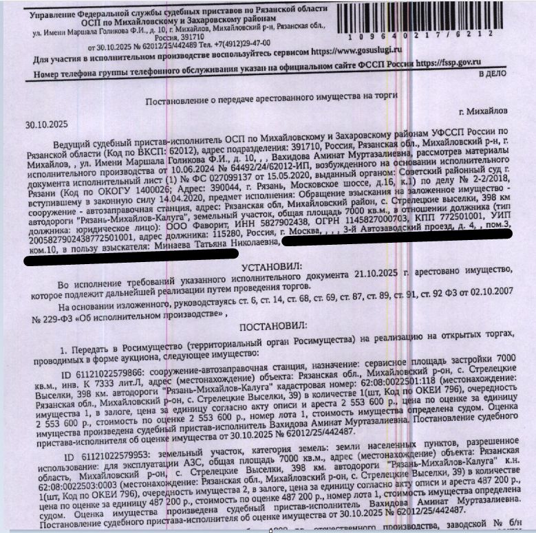 Сооружение автозаправочная станция, площадь 7000 кв.м., кадастровый номер 62:08:0022501:118, местоположение: Рязанская обл, р-н Михайловский, с/п Стрелецко-Высельское, с. Стрелецкие Выселки, 398 км автодороги Рязань-Михайлов-Калуга. Земельный участок, земли населенных пунктов, ВРИ: для эксплуатации АЗС, площадь 7000 +/- 29 кв.м., кадастровый номер 62:08:0022503:3, адрес: Рязанская обл, Михайловский м.р-н, Стрелецко-Высельское с/п, с. Стрелецкие Выселки, ЗУ 282. Ограничения прав на земельный участок, предусмотренные ст. 56 ЗК РФ. Взыскатель - Минаева Т.Н. Согласно выписке ЕГРН имеются сведения о залоге имущества в пользу АО "Российский Сельскохозяйственный банк". Реализация имущества должника не лишает права залогодержателя на обращение взыскания на предмет залога. Начальная цена: 3 040 800 (Три миллиона сорок тысяч восемьсот) руб. 00 коп., в том числе НДС. Задаток: 150 000 (Сто пятьдесят тысяч) руб. 00 коп. Шаг аукциона 1%: 30 408 (Тридцать тысяч четыреста восемь) руб. 00 коп.