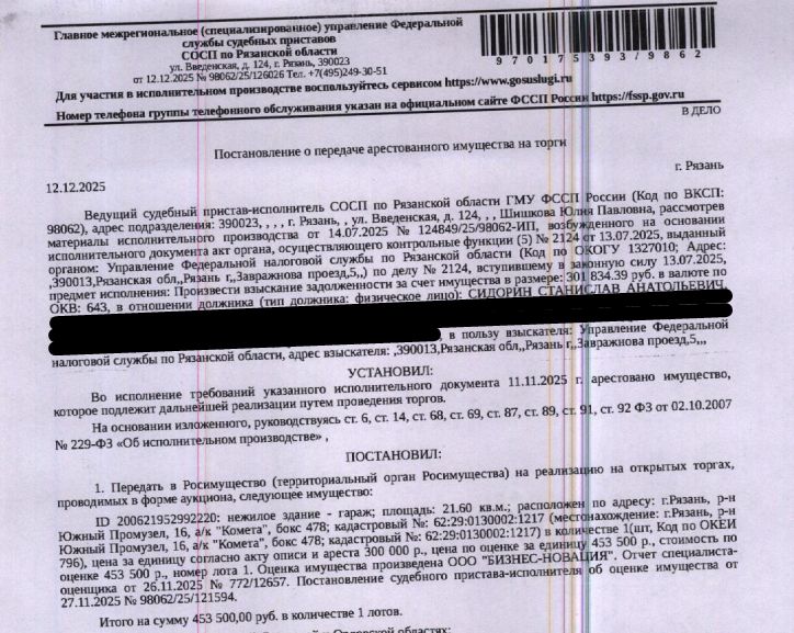 Здание, назначение: нежилое, наименование: гаражный бокс, площадь 21,6 кв.м, кадастровый номер 62:29:0130002:1217, адрес: г.Рязань, р-н Южный Промузел, 16, а/к "Комета", бокс 478. Здание расположено в пределах земельного участка с кадастровым номером 62:29:0130002:269, сведениями о правообладателе Организатор торгов не располагает. Взыскатель: УФНС по Рязанской области. Начальная цена: 453 500 (Четыреста пятьдесят три тысячи пятьсот) руб. 00 коп., без НДС. Задаток: 220 000 (Двести двадцать тысяч) руб. 00 коп. Шаг аукциона 1%: 4 535 (Четыре тысячи пятьсот тридцать пять) руб. 00 коп.