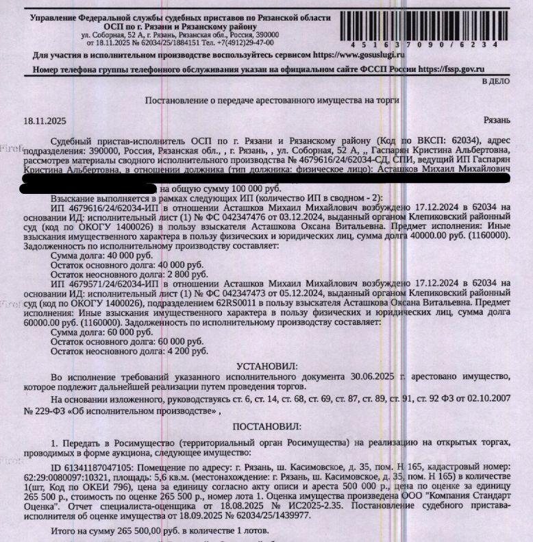 Помещение, назначение: нежилое, подземный этаж подвал, площадь 5,6 кв.м., кадастровый номер 62:29:0080097:10321, адрес: Российская Федерация, Рязанская область, городской округ город Рязань, город Рязань, Касимовское шоссе, дом 35, помещение Н165. Взыскатель: Асташкова О.В. Начальная цена: 265 500 (Двести шестьдесят пять тысяч пятьсот) руб. 00 коп., без НДС. Задаток: 130 000 (Сто тридцать тысяч) руб. 00 коп. Шаг аукциона 1%: 2 655 (Две тысячи шестьсот пятьдесят пять) руб. 00 коп.