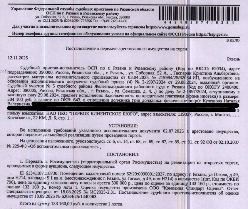 Помещение, назначение: нежилое, наименование: помещение, площадь 9,1 кв.м., кадастровый номер 62:29:0090001:2837, местоположение: Рязанская область, г Рязань, ул Гоголя, д 49, пом Н214. Взыскатель: НАО ПКО "Первое клиентское бюро". Начальная цена: 133 160 (Сто тридцать три тысячи сто шестьдесят) руб. 00 коп., без НДС. Задаток: 60 000 (Шестьдесят тысяч) руб. 00 коп. Шаг аукциона 1%: 1 331 (Одна тысяча триста тридцать один) руб. 60 коп.