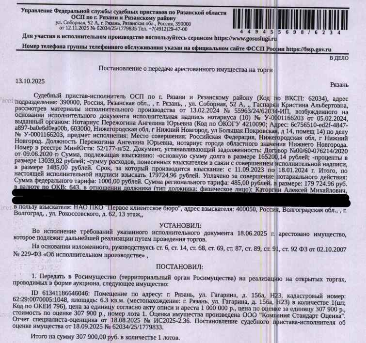 Помещение, назначение: нежилое, наименование: нежилое помещение Н23 в многоквартирном доме, площадь 6,3 кв.м, кадастровый номер 62:29:0070005:1048, местоположение: Рязанская область, г Рязань, ул Гагарина, д 156а, пом Н23. Взыскатель: НАО ПКО "Первое клиентское бюро". Начальная цена: 307 900 (Триста семь тысяч девятьсот) руб. 00 коп., без НДС. Задаток: 150 000 (Сто пятьдесят тысяч) руб. 00 коп. Шаг аукциона 1%: 3 079 (Три тысячи семьдесят девять) руб. 00 коп.