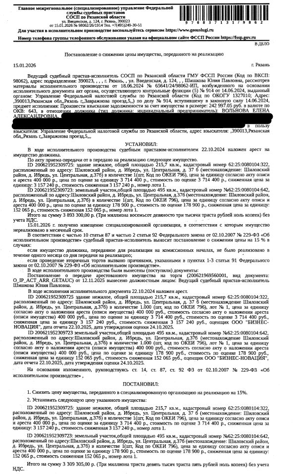 • Здание, назначение: нежилое, наименование: здание, площадь 215,7 кв.м., кадастровый номер 62:25:0080104:322, местоположение: Рязанская область, р-н Шиловский, д Ибредь, ул Центральная, д 37б. • Земельный участок, категория земель: земли населенных пунктов, виды разрешенного использования: социальное обслуживание, площадь 495 +/- 8 кв.м., кадастровый номер 62:25:0080104:642, местоположение: Рязанская область, р-н Шиловский, д Ибредь, ул Центральная, д 37б. Вид ограничений (обременений): ограничения прав на земельный участок, предусмотренные ст. 56 ЗК РФ. Взыскатель: УФНС по Рязанской области. Начальная цена 3 309 305 (Три миллиона триста девять тысяч триста пять) руб. 00 коп., без НДС, сумма задатка 1 600 000 (Один миллион шестьсот тысяч) руб. 00 коп. Шаг аукциона 1%: 33 093 (Тридцать три тысячи девяносто три) руб. 05 коп.